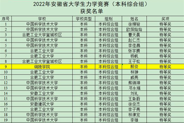 近日,由安徽省教育廳主辦的2022年安徽省大學生力學競賽已經圓滿結束,共有34所高校的1044名學生參賽。經過校賽初選,我校8名學生參加了省賽,有2個專業的4名同學獲獎,取得本科綜合組特等獎1項、二等獎2項、三等獎1項的驕人成績。